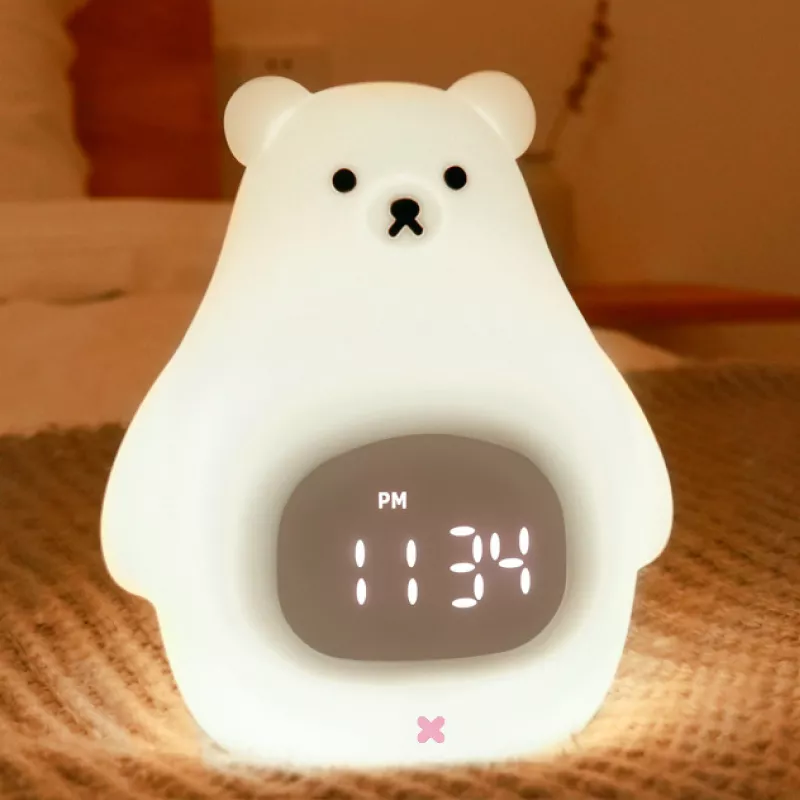 This cute bear-shaped alarm clock is more than just a functional timekeeper; it’s a comforting and reliable companion for your child. With its adjustable brightness, soft light, and playful design, it creates the perfect environment for both waking up and winding down. The snooze feature is ideal for those mornings when your child needs a little extra time to wake up, while the multi-color light adds a fun touch to their room decor. The simple touch controls make it easy for kids to operate on their own, fostering independence. Plus, the rechargeable battery ensures that the night light stays on throughout the night without the hassle of constant replacements. Whether you use it as a bedside lamp, an alarm clock, or a playful addition to their room, this cartoon bear light is sure to become a cherished part of their daily routine.